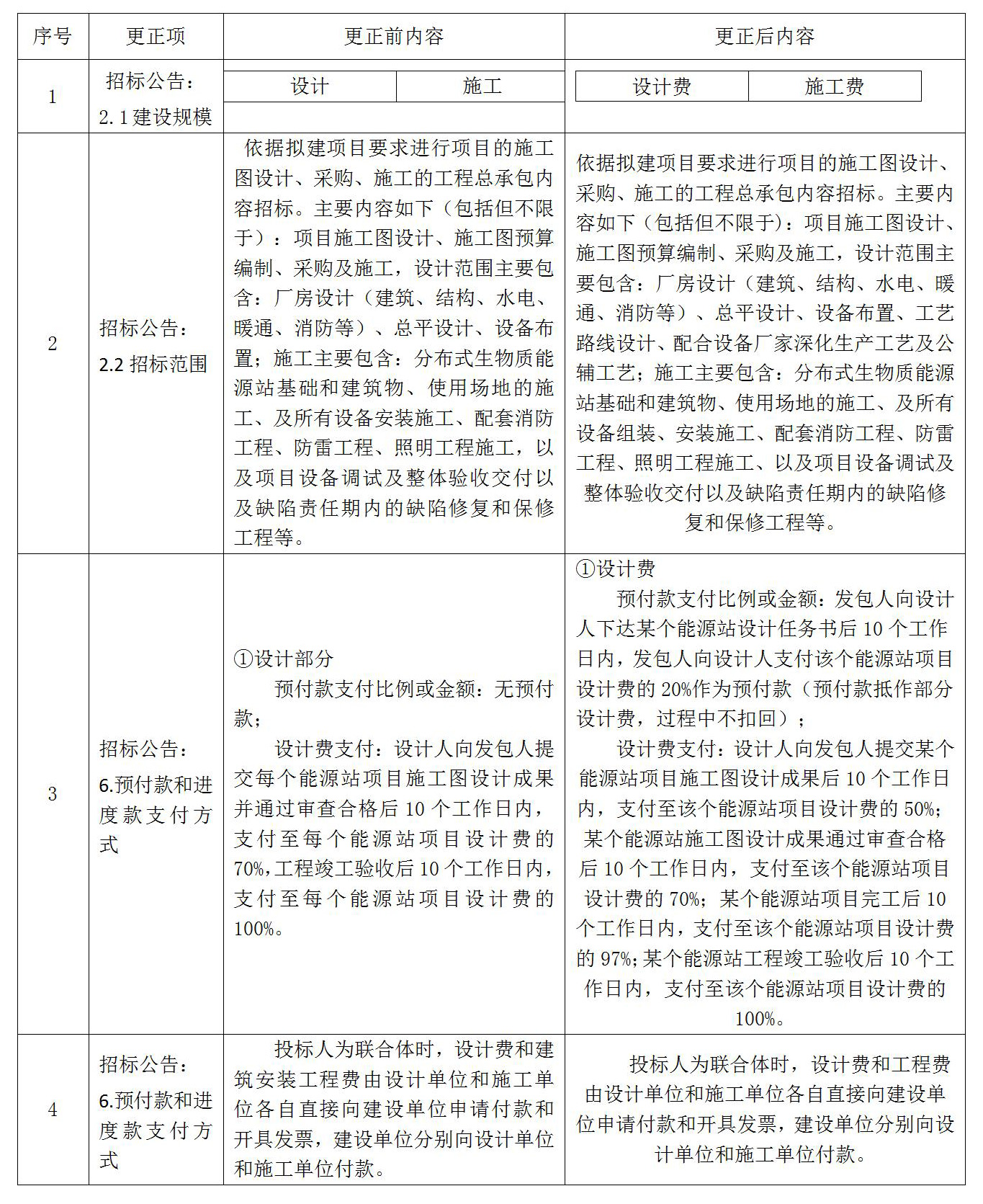中民兴邦分布式生物质能源站发电项目(一期)工程总承包更正公告 更新时间:2024-12-11 16:59:36 一、项目名称:中民兴邦分布式生物质能源站发电项目(一期)工程总承包 二、项目招标编号:GXZB2024-G2-000023-GXZX 三、首次公告日期:2024年12月05日 四、澄清(更改)事项、内容: 五、其他补充:文件中凡涉及以上更正内容的均作相应更正,其它内容不变。 六、本次公告同时在中国采购与招标网、广西中旭达工程项目管理有限公司网站、中民兴邦控股集团有限公司网站发布网上发布。 七、联系方式 1.招标人:中民兴邦控股集团有限公司 地址:南宁市青秀区长湖路65号五楼 联系人:陆工 联系电话:13277826707 2.招标代理机构:广西中旭达工程项目管理有限公司 地址:广西南宁市良庆区玉洞大道云创谷3栋805 联系人:阮学燕 电话:0771-5349639 广西中旭达工程项目管理有限公司 2024年12月11日